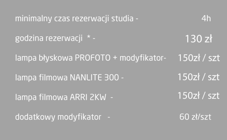 Rezerwacji studia , można dokonać tylko drogą mailową . Potwierdzenie rezerwacji studia jest jednoznaczne z akceptacją regulaminu oraz cennika.